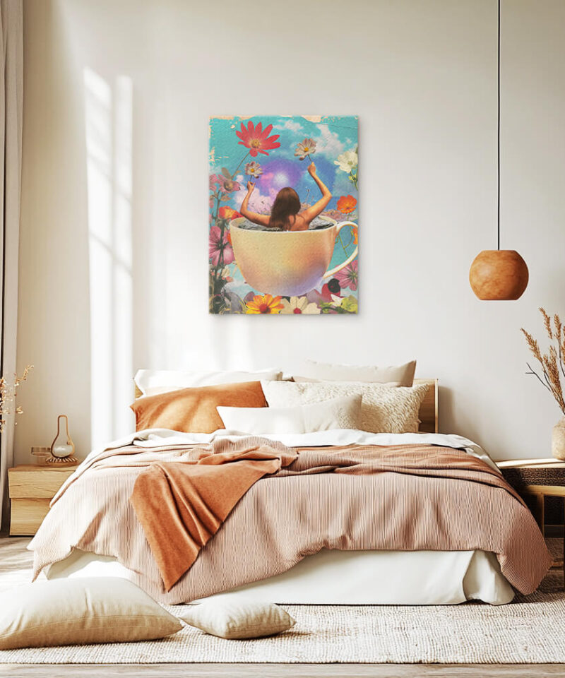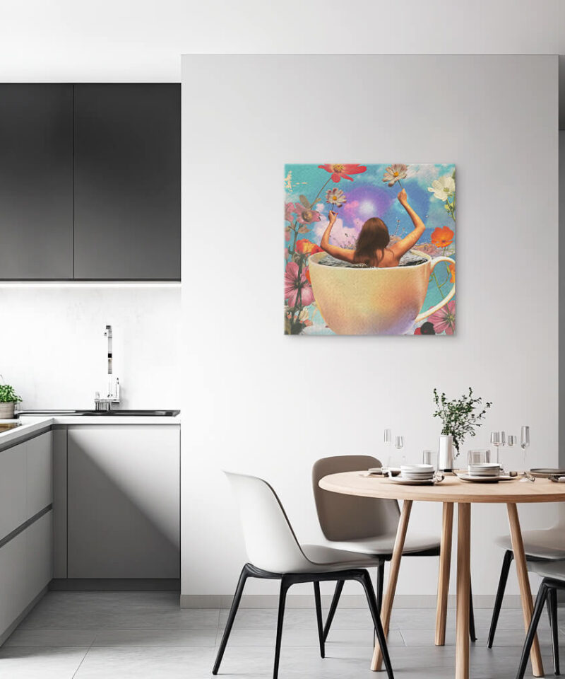 A silhouette rises from the depths of a teacup, steam curling into the shape of a woman. It is a vision woven from warmth and imagination, a sip away from another world.