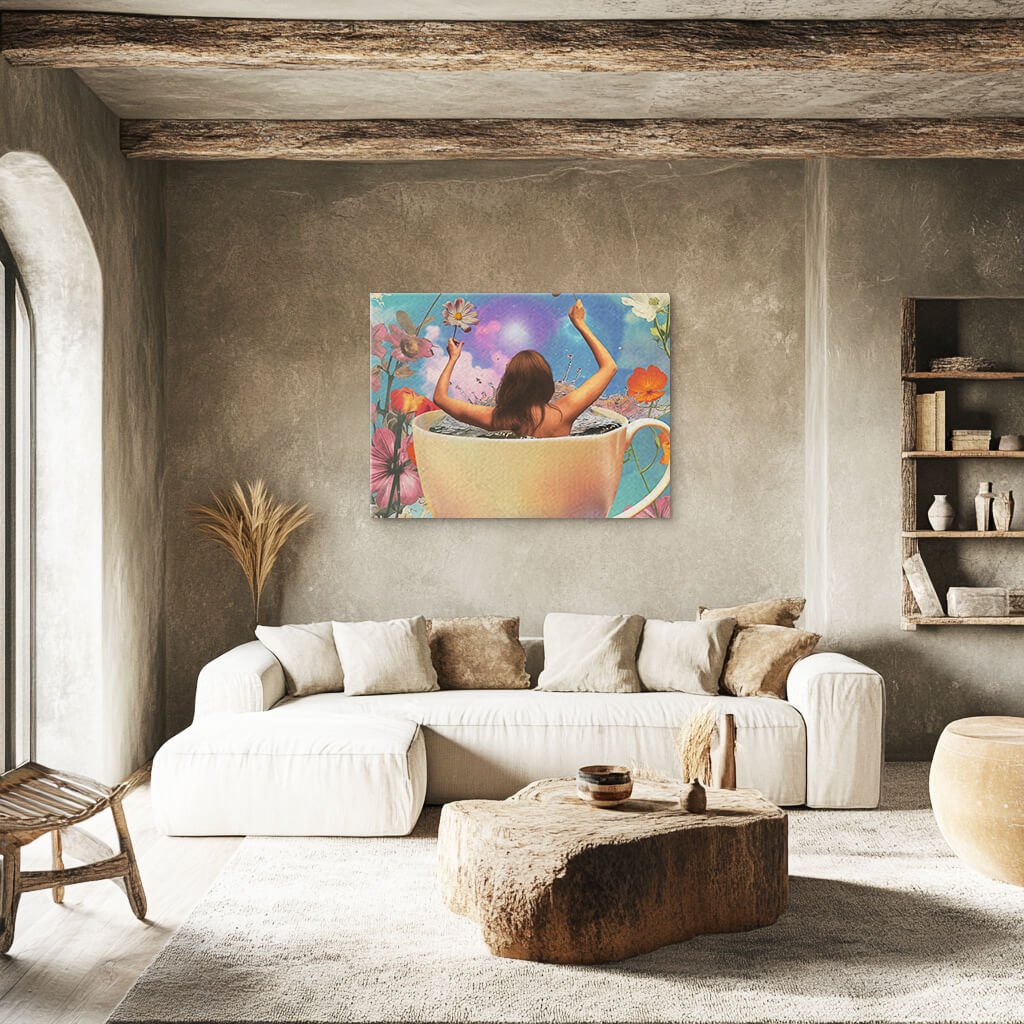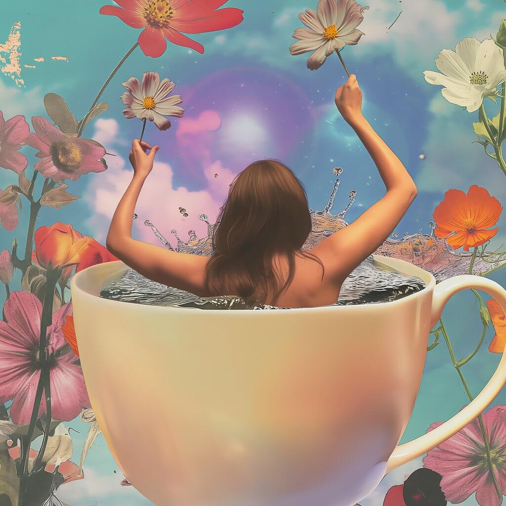A silhouette rises from the depths of a teacup, steam curling into the shape of a woman. It is a vision woven from warmth and imagination, a sip away from another world.